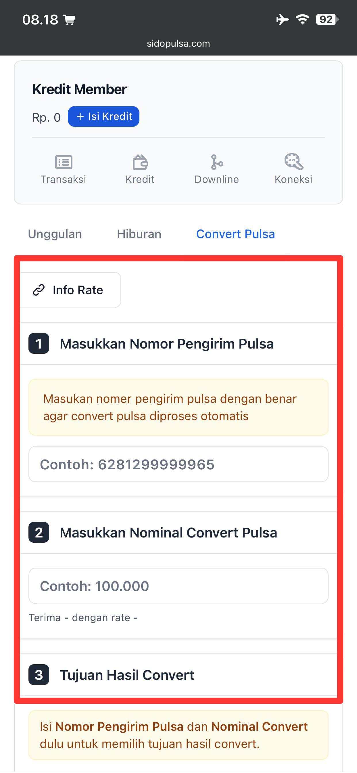 Isi data pada form convert: masukkan nomor pengirim pulsa (nomor yang akan mentransfer pulsa/nomer pengirim pulsa), isi nominal convert, lalu pilih tujuan hasil convert.