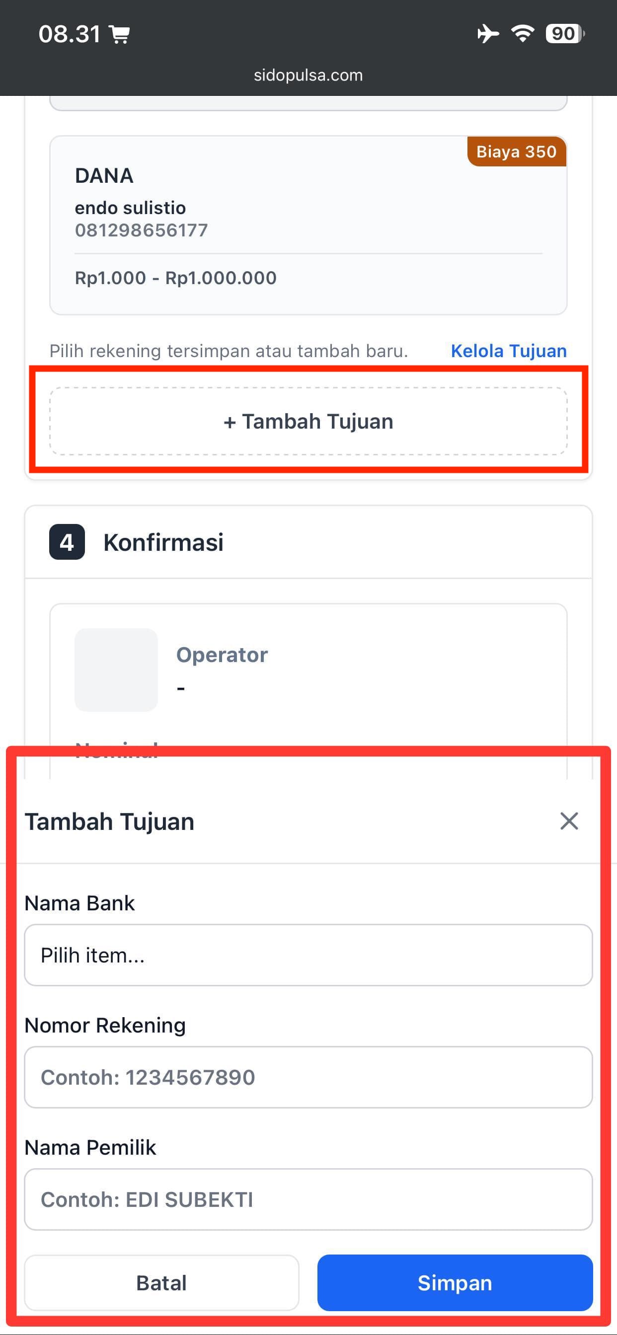 + Tambah Tujuan untuk menambahkan tujuan hasil convert lebih dari 1, lalu isi data tujuan: Bank/Ewallet & masukan nomer rekening.